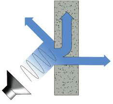 lado: uma onda sonora, emitida por um alto falante, está batendo em uma superfície